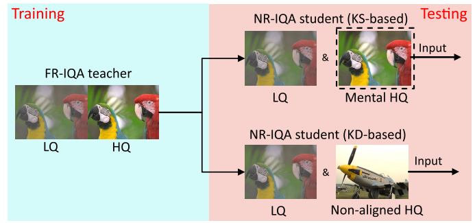 • We propose a novel Knowledge-Sharing IQA (KSIQA) architecture that enables efficient knowledge transfer by jointly training an FR-IQA teacher and an NR-IQA student with a shared decoder.